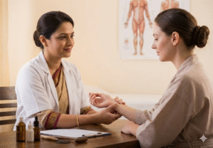 - The therapy begins with a detailed doctor consultation along with Nadi Parikshan to understand your dosha balance and the nature of tension in the neck and shoulder region. The doctor evaluates factors such as muscle tightness, posture-related strain, work habits, and stiffness patterns before selecting the most suitable Ayurvedic oil. This personalized assessment ensures that the oil used during the therapy supports muscle relaxation, circulation, and comfort specific to your condition.